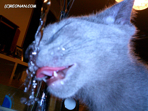 蛇口から流れるお水を飲むれおにゃん。どアップで。